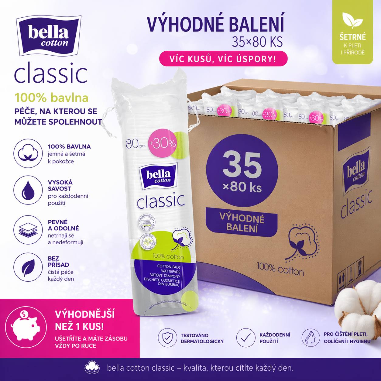 Odličovací tampony 80 ks + 30 % navíc Praktické balení odličovacích tamponů 80 ks + 30 % navíc za skvělou cenu 35 Kč za balení. Jemné, savé a šetrné k pleti, ideální pro každodenní odličování i citlivou pokožku. Výhodné balení šetří čas i peníze a zajišťuje dostatečnou zásobu tamponů na delší dobu. Při nákupu více balení je k dispozici atraktivní množstevní sleva, která ještě více zvýhodní cenu. Výhody: 80 ks + 30 % tamponů navíc v každém balení Jemné k pleti, vhodné i pro citlivou pokožku Skvělá cena 35 Kč za balení Množstevní sleva při nákupu více balení.